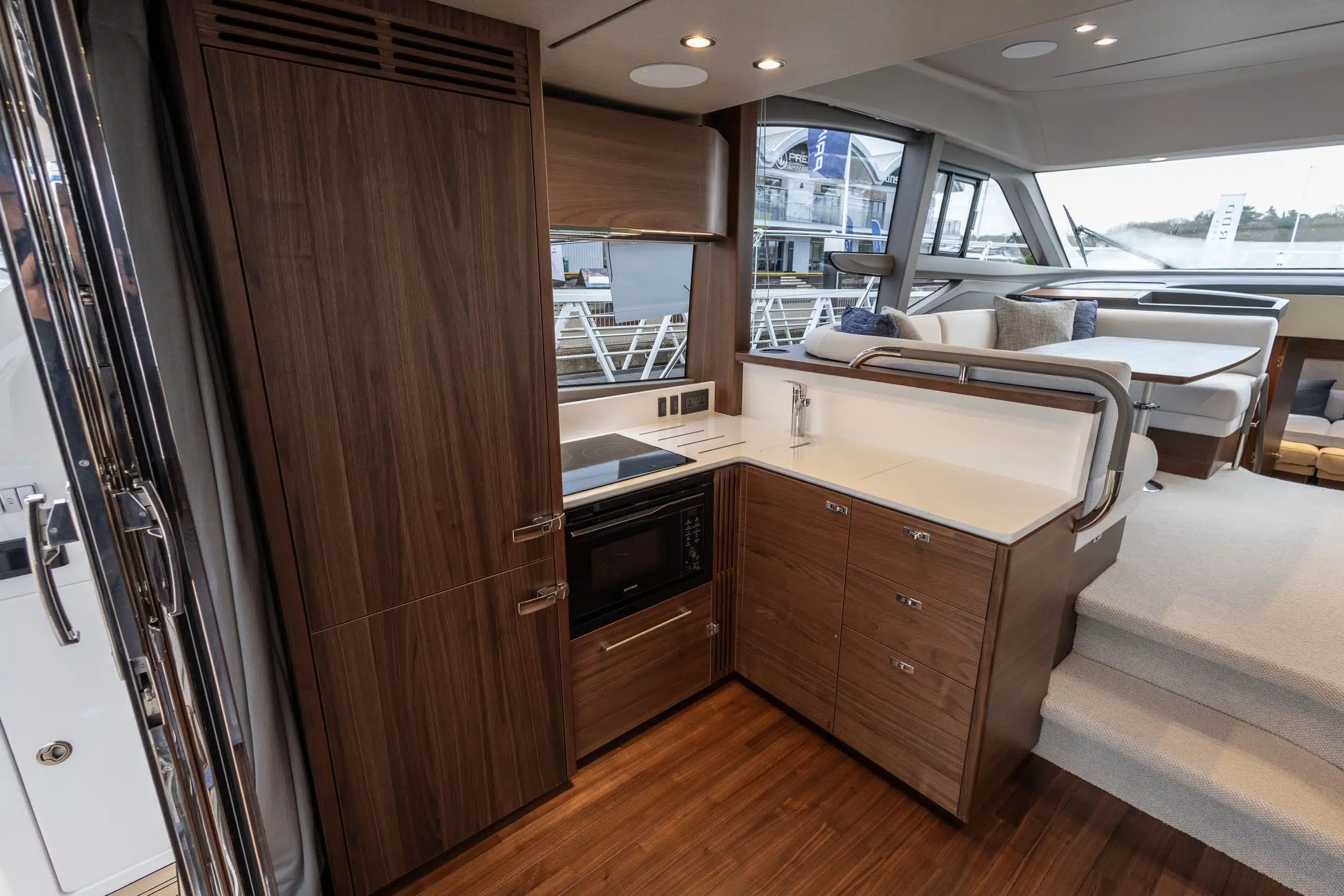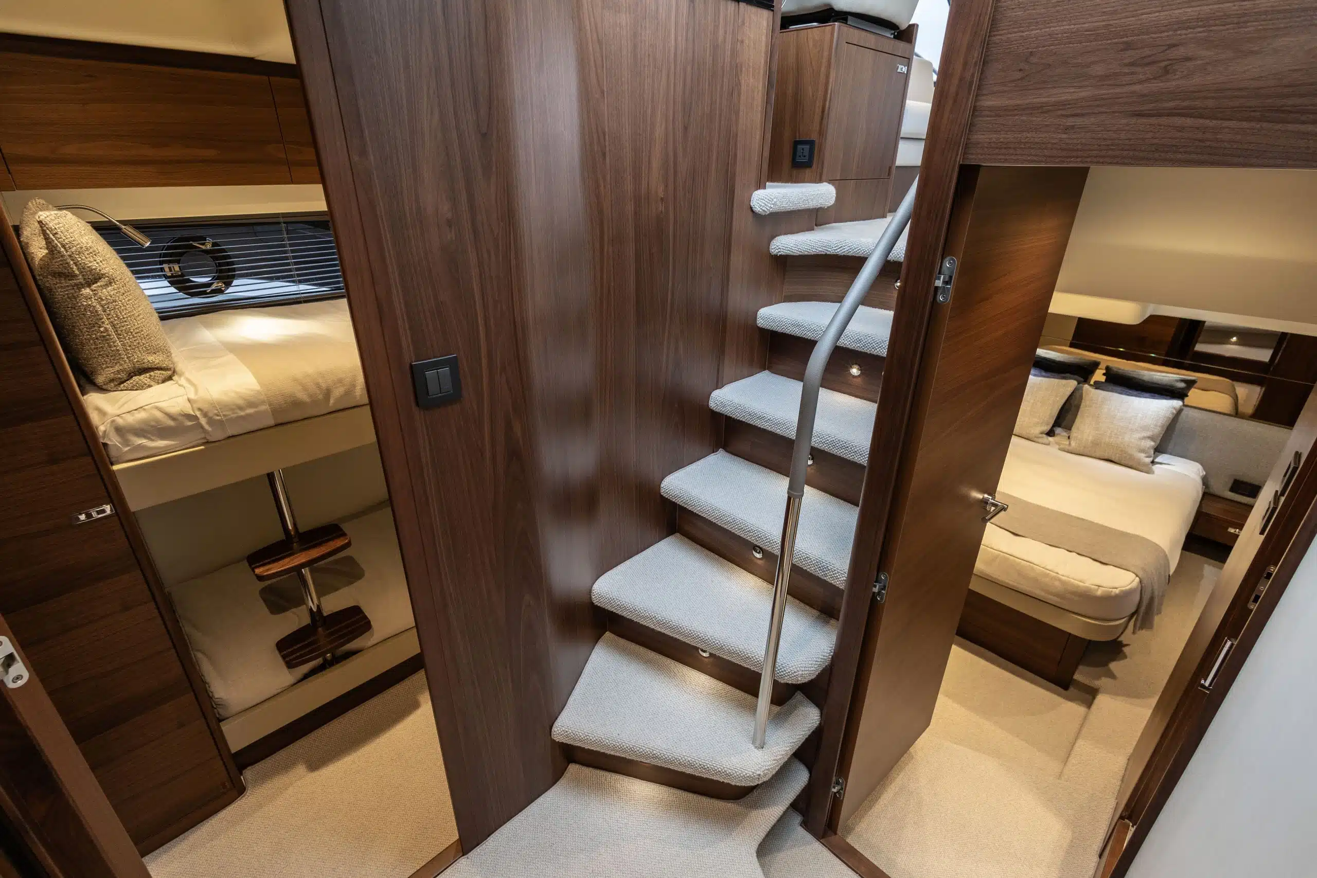 This model features a sociable cockpit leading through to the main saloon, with a galley aft, a large U-shaped sofa and a dining table for up to six guests. Head up to the flybridge to enjoy a spacious U-shaped aft seating area, twin helm seats and forward L-shaped seating. Guests are accommodated across three beautifully appointed cabins, two of which are ensuite. The forward cabin’s scissor berths offer complete flexibility for guests.