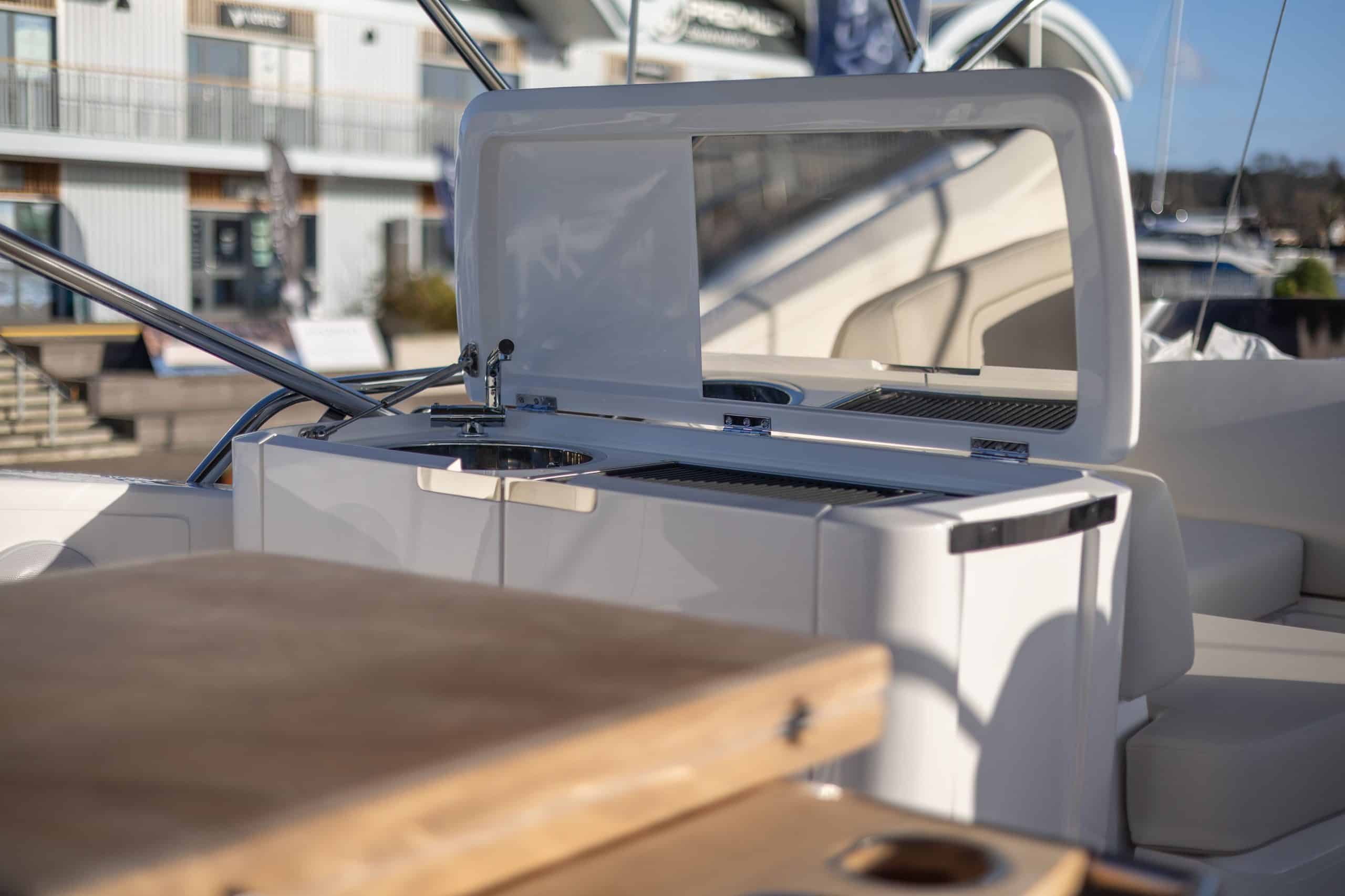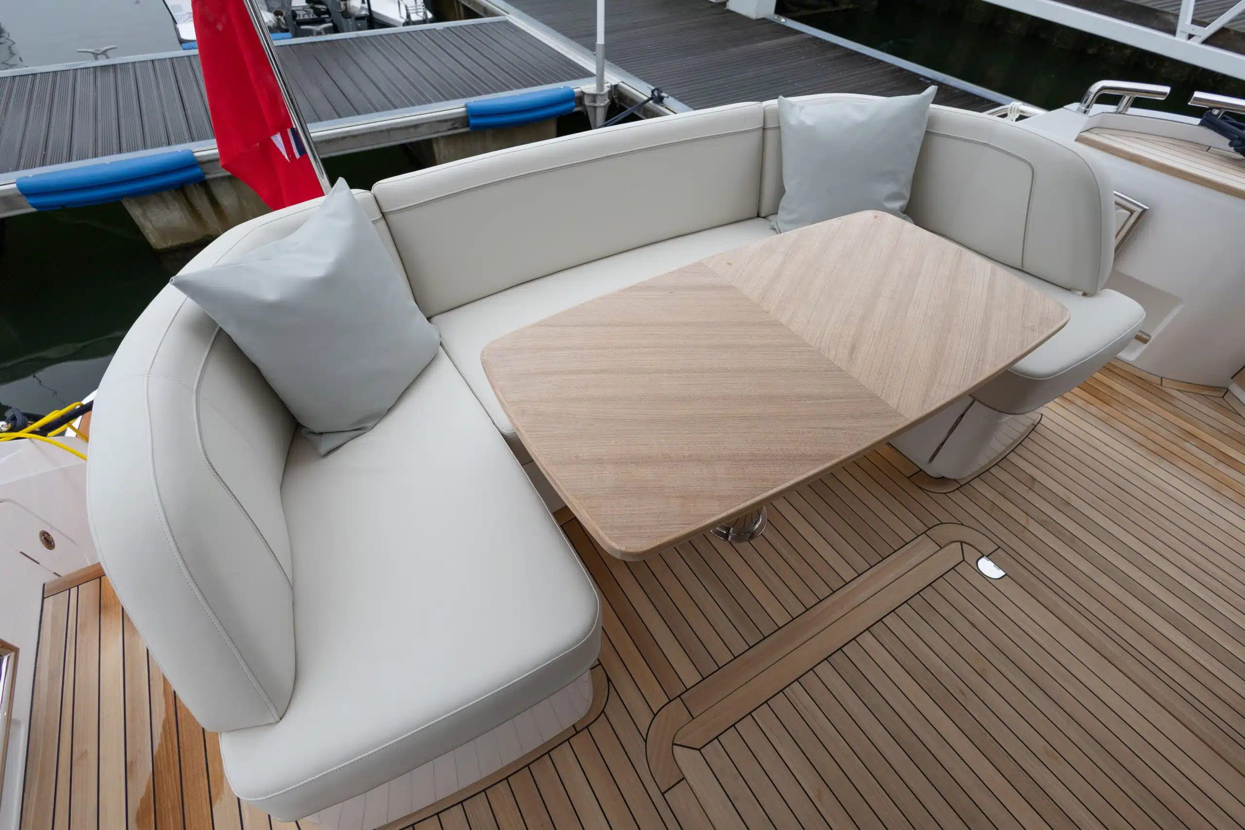 Twin Volvo IPS 800 (2 x 600 mhp) Engines • Bowthruster (120Kgf) with dual station controls • Volvo Automatic Interceptor trim tabs • Onan 11Kw generator • Walnut interior wood, satin finish • Deck saloon table with conversion to double berth • Electro-hydraulic transom platform • Scissor berths in forward cabin • Flybridge wetbar with sink, electric griddle/ BBQ and storage • Premium upholstery throughout • Stainless steel Lewmar Epsilon anchor • Dishwasher • Combination washer/dryer • Full height fridge/freezer (270ltr) • Premium audio system with LED TV’s in saloon and accommodation • Onboard Wifi • Garmin GMR 24 xHD3 colour radar with 24″, 4Kw Radome • Reverse cycle air-conditioning/heating