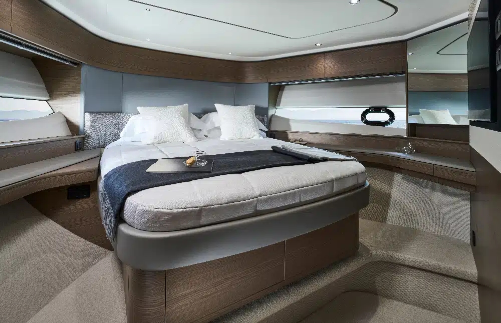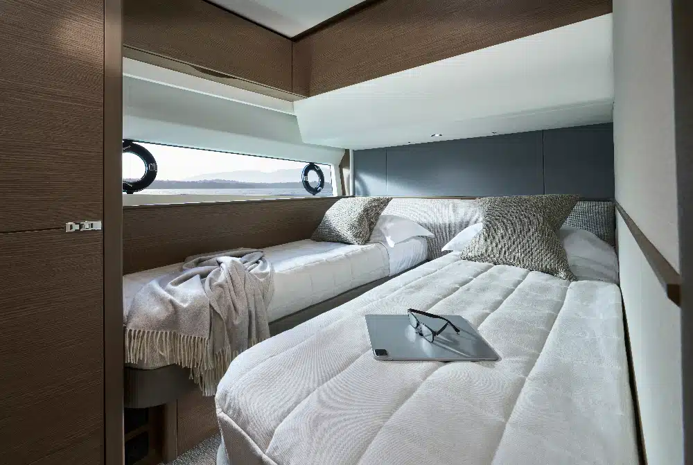 Twin MAN V12-1400 engines (2 x 1400mhp) • Walnut interior wood, satin finish • Gyro stabilisation (Seakeeper 18) • Variable speed (eVision) bow and stern thrusters with hold-function docking facility • Princess Connect Telemetry & Maintenance System • Teak laid decks • Electrically operated sun awning to aft end of cockpit • Electro-hydraulic telescopic passerelle with automatic handrails • Teak laid decking • Electric stern rope handling winches • Williams 345 tender • Seabob storage rack • Dual Raymarine Axiom 2 XL 15.6″ colour multifunction displays at each helm • Onan 19kW generator • Premium Fusion audio packages with Focal speakers • Onboard wifi network • Starboard twin cabin with sliding conversion to double berth • Aft cabin fitout • Reverse cycle air-conditioning/heating