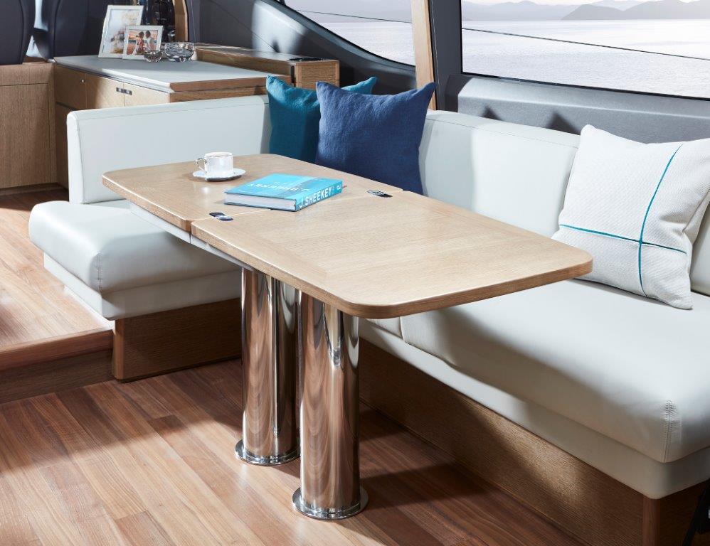 Careful attention has been paid to the spaciously designed cockpit and fully equipped dining area, allowing you to enjoy time with family and friends. Offering aft and foredeck sunpads, you won’t be short on sunbathing space for those warmer days. Climate control, sliding doors and a retractable sunroof, provides you the flexibility to utilise the V65 in all weathers and on all occasions. A large transom allows you to enjoy watersports at ease, as its hydraulics lower you gently into the water.