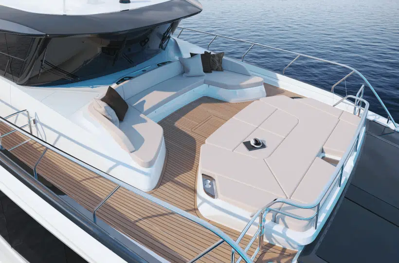 Moving aft, the Skylounge canopy provides shaded comfort over the dining area, perfect for those looking to stay cool while enjoying the sea views from this sensational deck. Beyond the dining space, the aft deck offers a variety of customizable layout options, including a spa bath, an optional bar, or the flexibility to leave the area open for loose furniture. There’s also the option to add a crane for tender storage, maximizing the deck’s functionality. The flybridge foredeck enhances the entertaining options further, with forward and aft-facing seating areas around a coffee table, which can easily be converted into sun loungers by flipping the backrests.