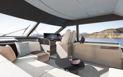 At the foredeck, owners can enjoy a redesigned sunpad with adjustable headrests, forward-facing seating, and the option of a removable teak table – perfect for relaxation or entertaining.