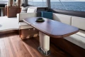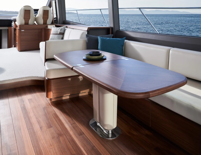 Her contemporary flybridge is the perfect outdoor entertaining area, with ergonomic dining seating, wetbar with barbecue, coolbox and sink, plus an aft sunbed and L-shaped companion seat with infill as a secondary sunbed.