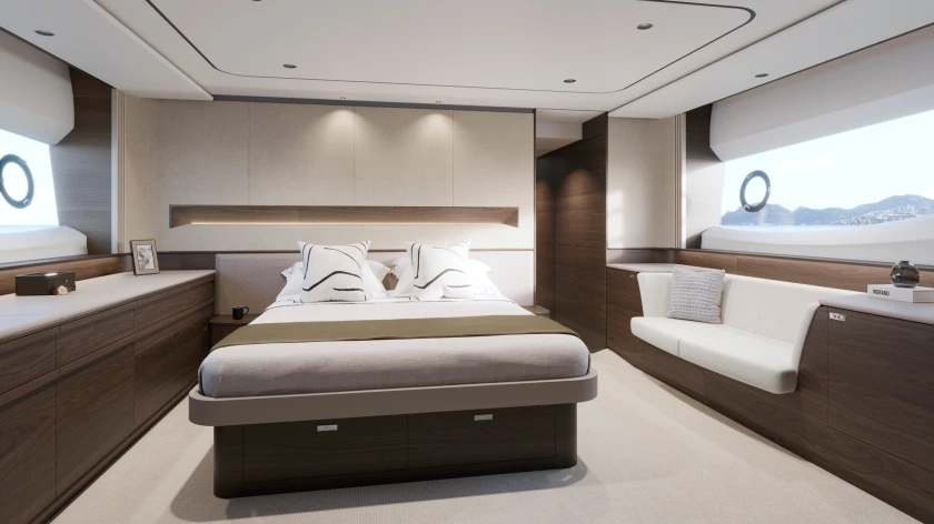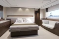 The expansive main deck is segmented into an aft galley with dinette, saloon with large U-shaped sofa plus companion seating opposite the helmsman area which features a side access door to the deck. The foredeck provides the perfect spot to enjoy outdoor relaxation with split sunpads and the ability to include an integrated cool box.