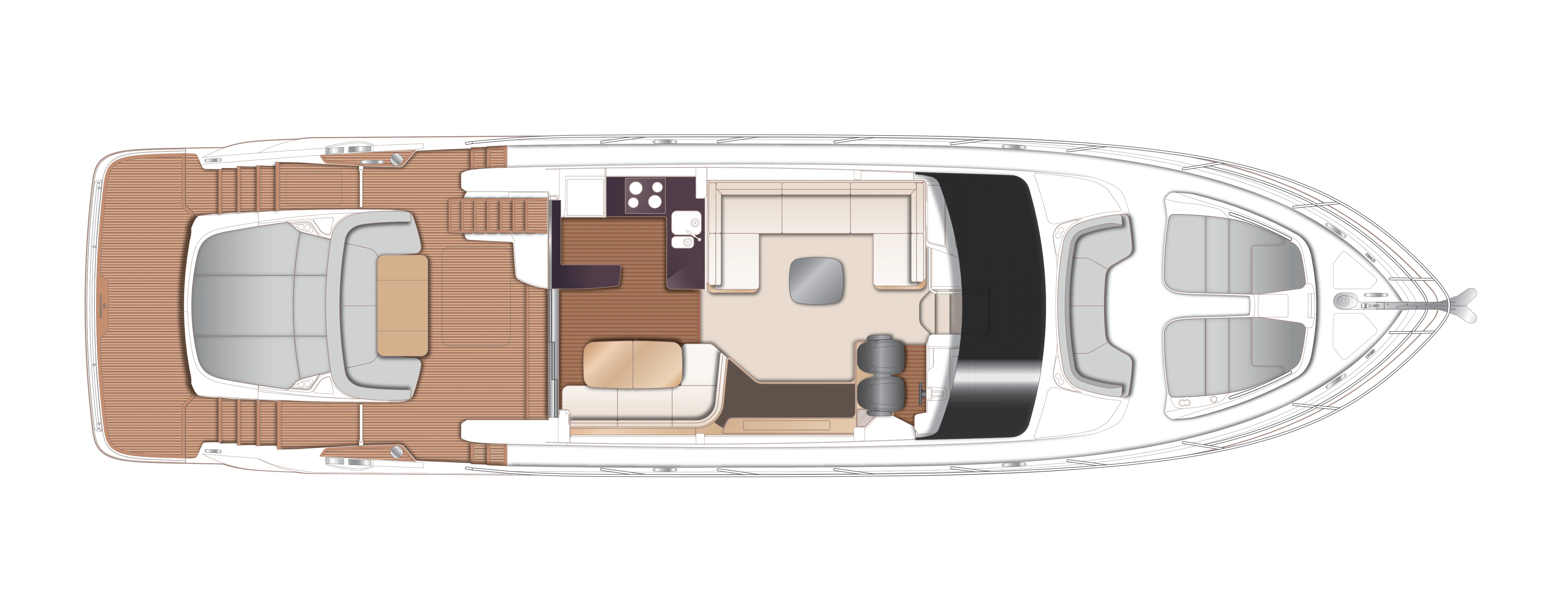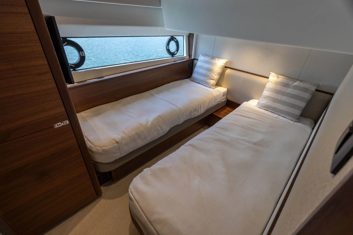 Twin MAN V12-1400 engines (2 x 1400mhp) • Walnut interior wood, satin finish • Seakeeper 18 Gyro stabilisation • Variable speed (eVision) bow and stern thrusters with hold-function docking facility • Princess Connect Telemetry & Maintenance System • Teak laid decks • Electrically operated sun awning to aft end of cockpit • Electro-hydraulic telescopic passerelle with automatic handrails • Teak laid decking • Electric stern rope handling winches • Williams 345 tender • Seabob storage rack • Dual Raymarine Axiom 2 XL 15.6″ colour multifunction displays at each helm • Onan 19kW generator • Premium Fusion audio packages with Focal speakers • Onboard wifi network • Starboard twin cabin with sliding conversion to double berth • Aft cabin fitout • Reverse cycle air-conditioning/heating