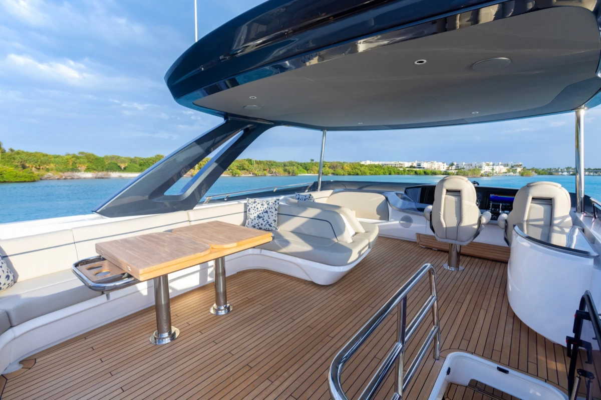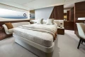 Below deck, eight guests enjoy four beautifully appointed cabins, three of which are ensuite and all are bathed in natural light from elegant hull glazing, with a further twin cabin with en-suite aft for occasional guests or crew. A dedicated staircase leads from the main deck to the full-beam owner’s stateroom amidships, via a private lobby area in the lower. On the upper deck, the Princess S72’s sportbridge invites outdoor living with a large U-shaped dining area, wetbar with barbecue and L-shaped seating forward that easily converts into a sunbed.
