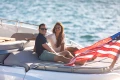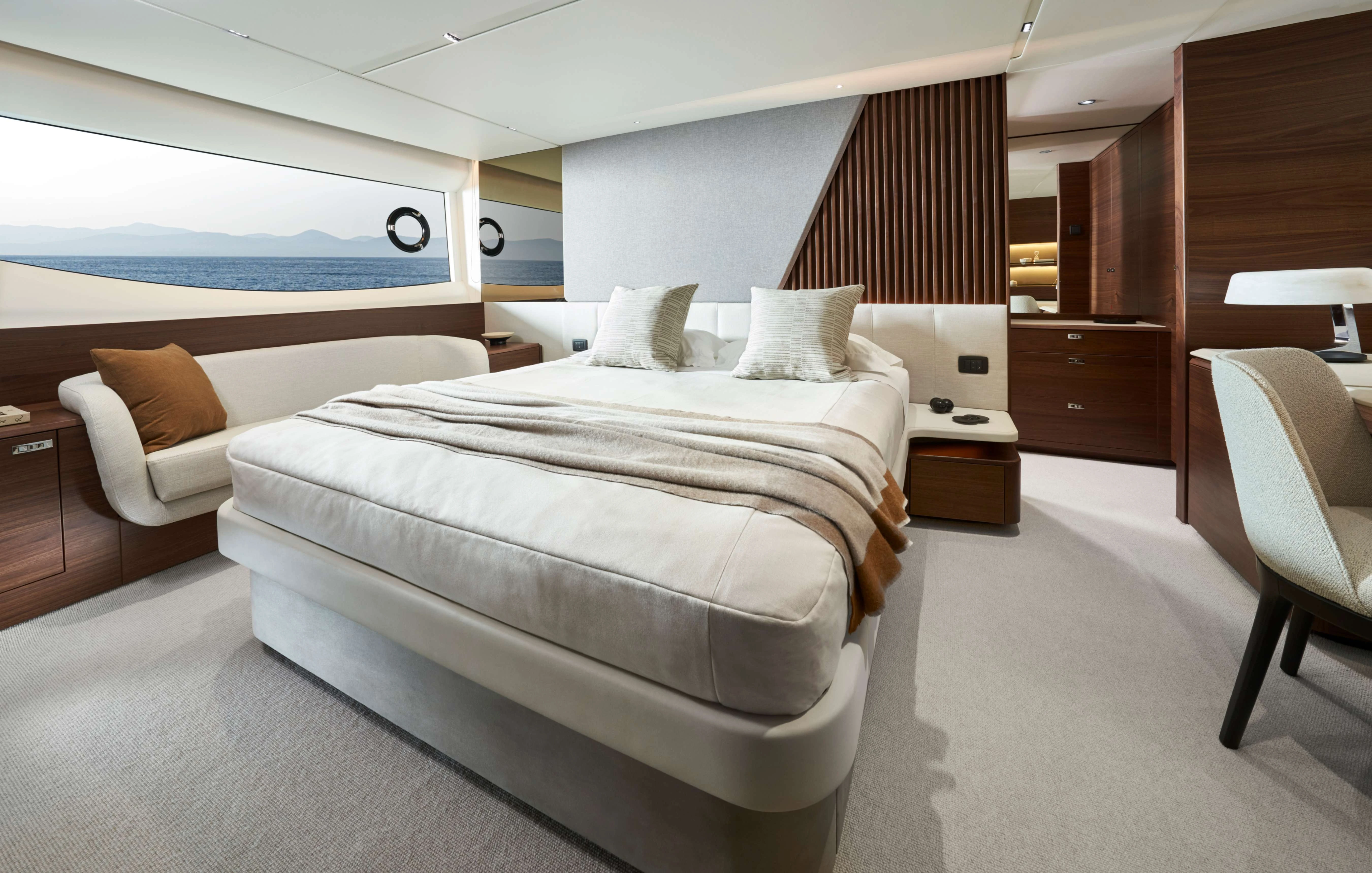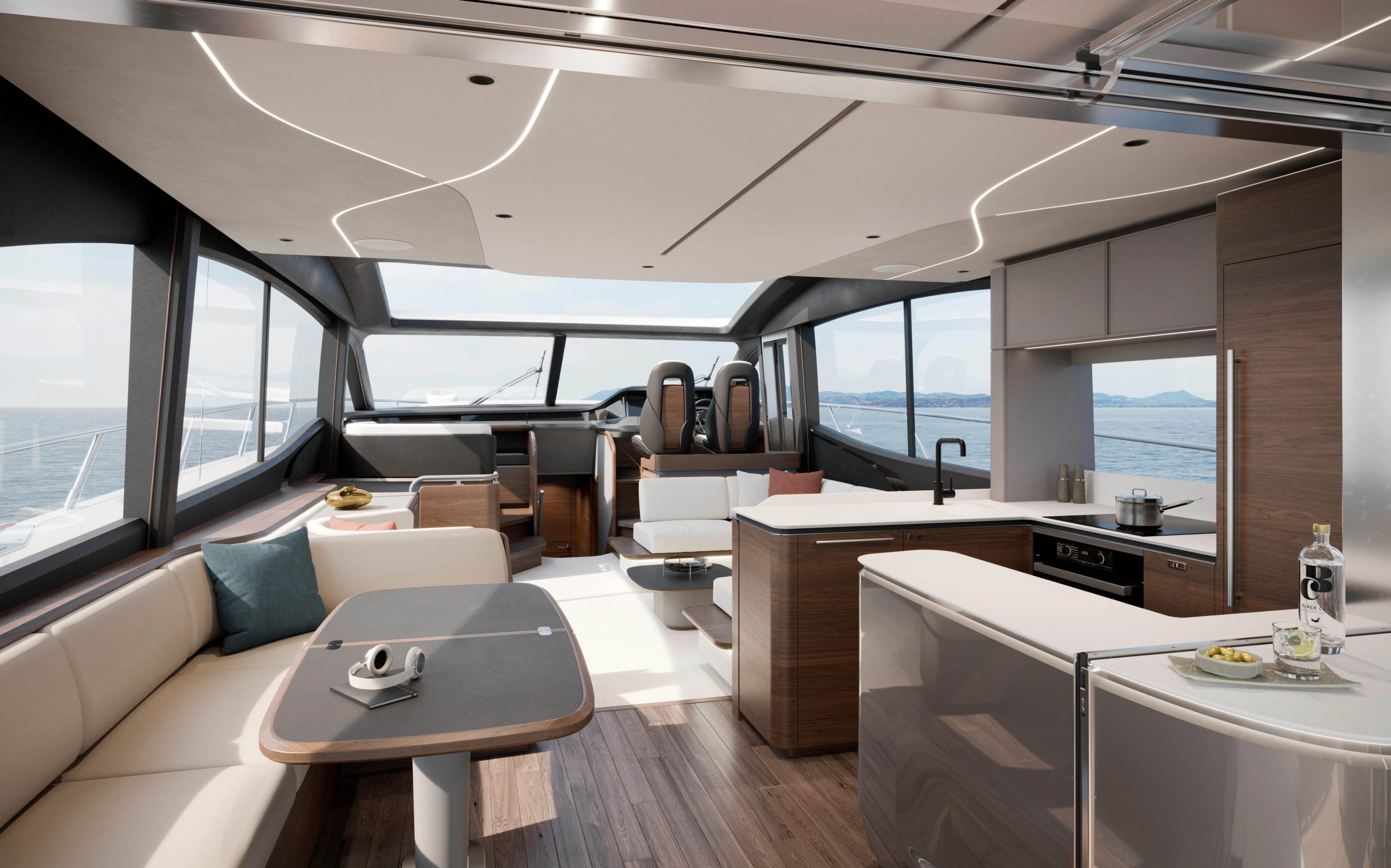 The spacious foredeck boasts innovative sunbeds with integrated adjustable headrests, which can be converted to create additional aft facing seats, whilst a locker between the sunbeds can be specified as an additional cool box. The stern houses a generous garage and can comfortably accommodate a 3.9m tender, creating the perfect base for watersports.