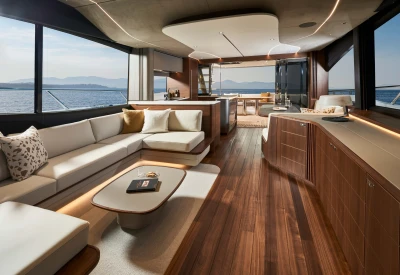 The cockpit features a unique U-shaped seating area with modular seating, folding teak table and servery unit – a place to entertain or just sit back and relax while enjoying the yacht’s exhilarating performance. The triple-sliding saloon doors create a harmonious connection between exterior and interior and the cockpit bar connects to the galley to create an almost seamless transition. A glass window partition folds up from the unit below to provide servery access when entertaining. Her cavernous main deck saloon with U shaped sofa is designed for sociable living. Using dynamic lines and convivial seating, she seamlessly connects to the world outside through full-length side windows. The fully equipped galley opposite the large L-shaped dining area, is perfectly place for hosting.