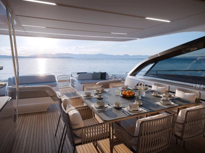 The cockpit and transom have been designed to maximise onwater enjoyment, with a garage to port side with Williams tender launch system, capable of holding up to a Williams SportJet 435 plus an electro-hydraulic bathing platform. The cockpit provides a large functional area in which to spend time with loved ones. Twin sunpads (the largest ever seen on an S Class yacht) border the central access steps, whilst the configurable cockpit seating area with twin coffee tables is the perfect place to enjoy a sundowner.