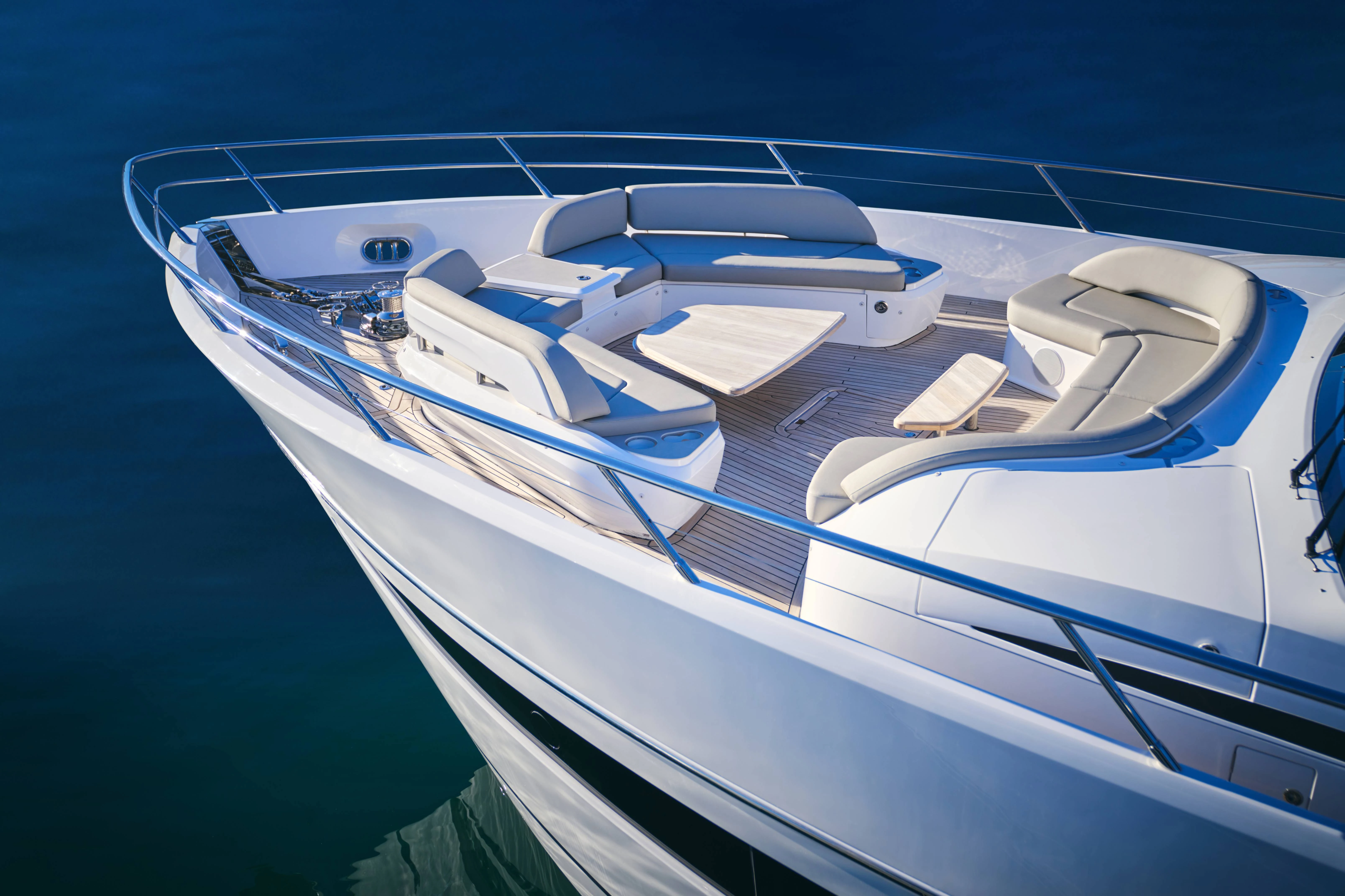 Full length windows flow along the main deck, extending either side of the cockpit canopy to provide a sheltered area from the sun. High bulwarks complete with oval stainless-steel rails, a vast teak laid deck, and tailored natural materials define the flagship status of this new S Class model, blending luxurious and contemporary finishes in perfect harmony.