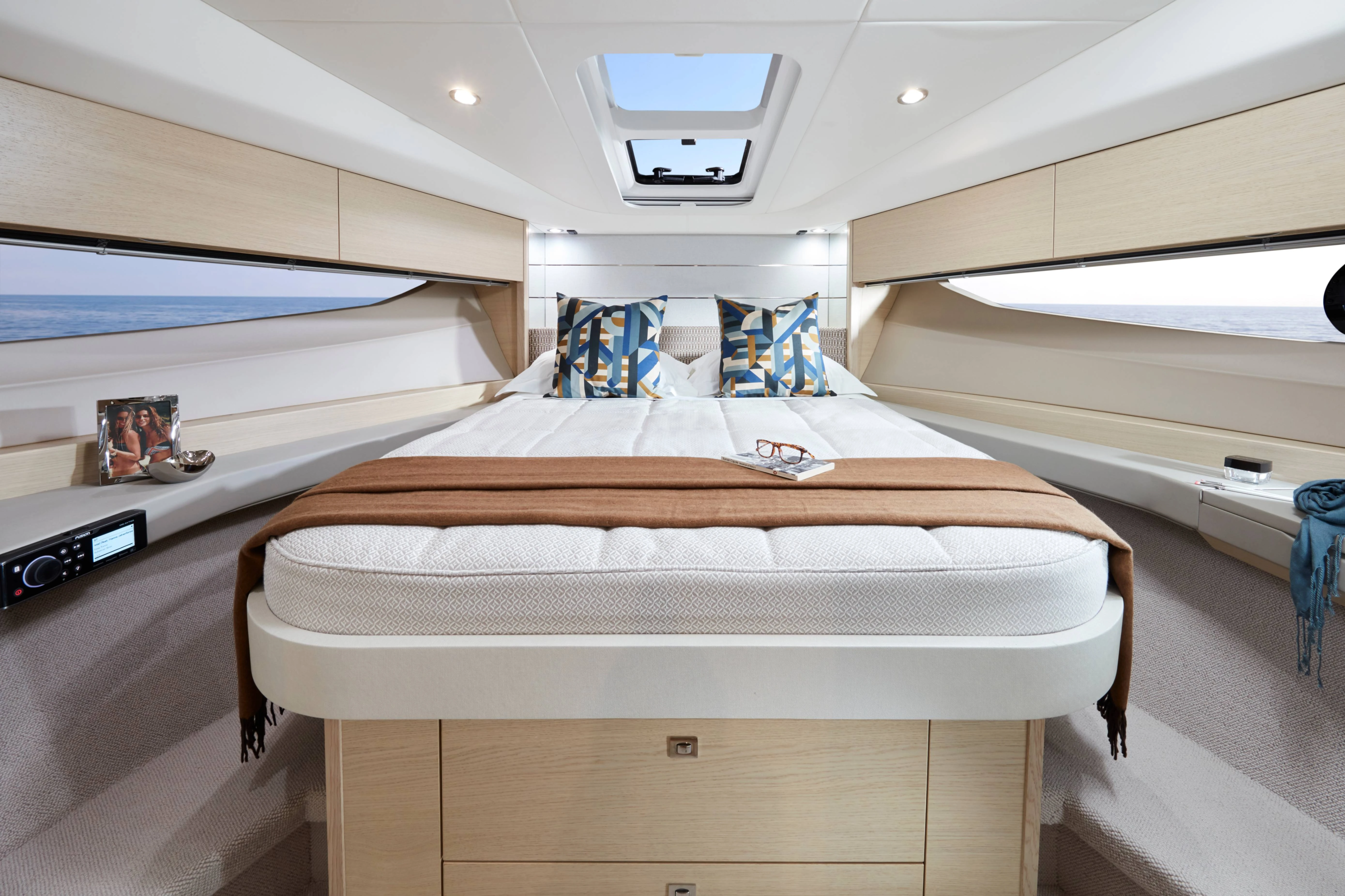 Twin Volvo D6-380 (2 x 380hp) diesel engines with joystick control • Bowthruster • Walnut interior wood satin finish • Sunbed conversion option with aft seat extension and sliding backrest • Electro-hydraulic transom platform • Cockpit wetbar with Kenyon electric BBQ • ONAN 6 kW/50Hz generator • Reverse cycle airconditioning/ heating • Ceramic electric hob (2 burner) • Aft cabin with sliding double berth conversion • Raymarine navigation equipment • Saloon TV & Audio Package • Multi sockets throughout • On-board Wi-Fi network