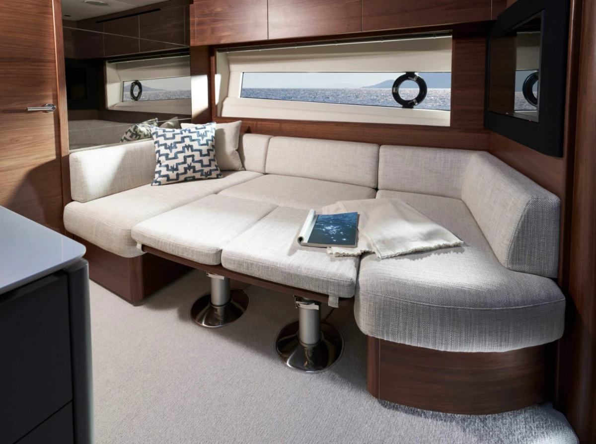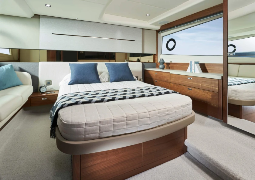 Below deck, there is a sociable galley with sociable entertaining space with a sofa and table. Elsewhere, four guests can be accommodated over two beautifully lit cabins. A full-beam master stateroom, a renowned feature of Princess yachts, sits mid-ships taking advantage of the space. The forward en-suite has additional access to the saloon for day access too.
