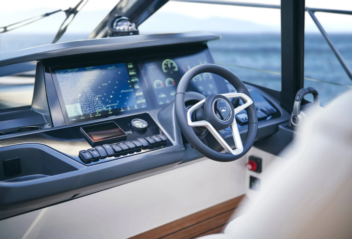 The Princess V50 is a fantastic representation of Princess’ forward thinking design and engineering. An intuitive IPS system and joystick allows for easy owner piloting, whilst the addition of a fully integrated Volvo Penta assisted docking system can make management of factors such as wind and current a breeze – even manoeuvring in crowded marinas has been made easier. Additional technology on this new model includes premium Naim audio and the new Garmin on-deck smart boat system, allowing owners to track and monitor their yacht remotely.
