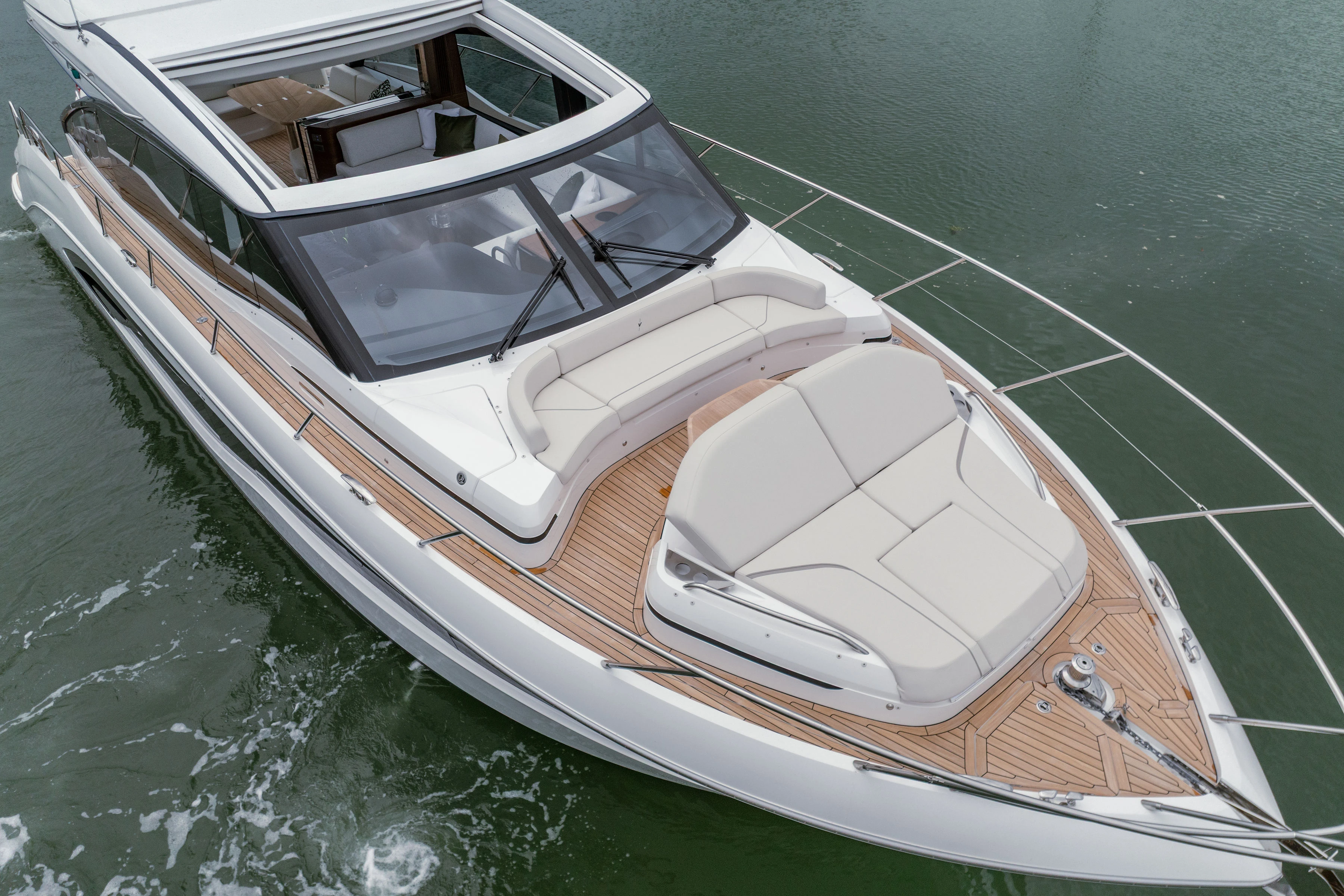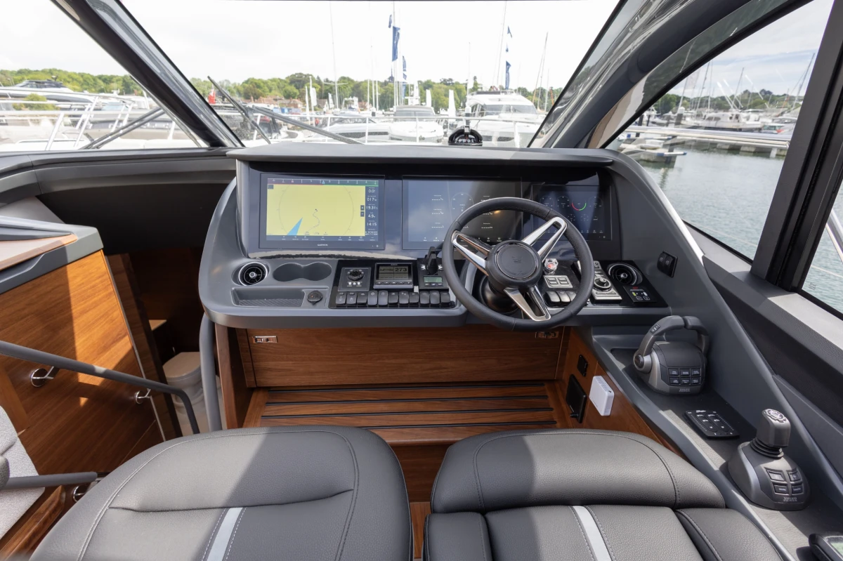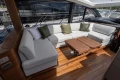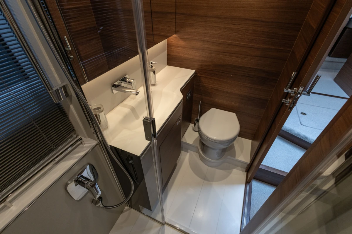 Twin Volvo D13-1000 (2 x 1000hp) diesel engines • Volvo joystick control • White gelcoat hull • Walnut interior wood, satin finish • Three cabins accommodating six guests • Teak laid decks • Seakeeper 9 gyro stabilisation • Variable speed bow and stern thrusters • Saloon dining/coffee table with electrically operated leg mechanisms • Concealed galley storage unit with electric lift • Aft cabin fitout • Onan 17.5kW generator • Garmin 434 XHD3 radar • Reverse cycle air-conditioning • Underwater lighting • Electrically operated sun awning to aft end of cockpit in grey • Electro-hydraulic telescopic passerelle • Icemaker • Combination washer/dryer • Premium audio package • Onboard ethernet WiFi network