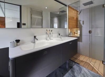 Her interior is just as captivating, with the outside welcomed in via the large windows which flow either side of the entire length of the main deck, encasing the saloon, galley and forward dining area. The use of natural and ambience lighting, innovative design and exquisite materials are combined here to create an idyllic space in which to while your time. Below deck, 8 guests are accommodated across 4 guest cabins, each with their own private en-suite. A full-beam master stateroom is located amidships, with the option to configure the main deck as above. Located aft of the main guest accommodation is the crew quarters which can accommodate 3 crew with the standard layout.