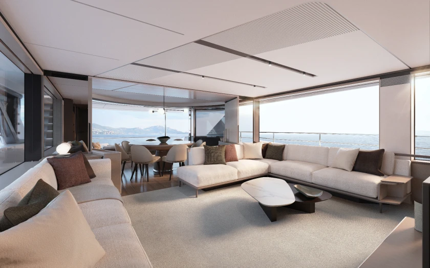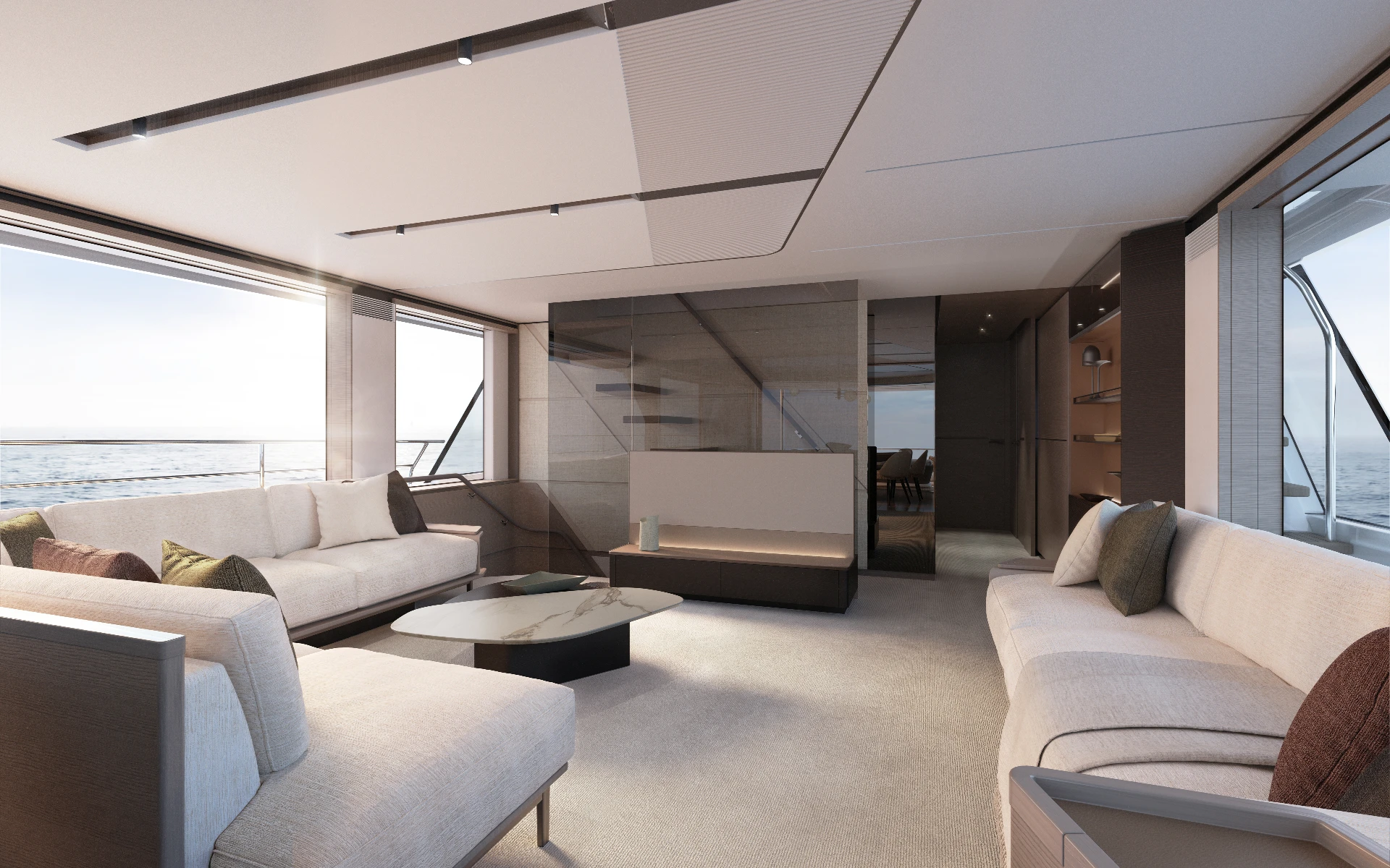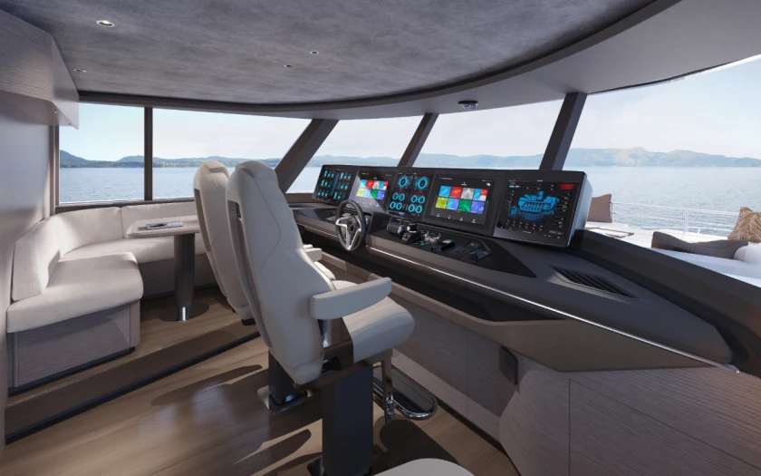 A full-beam master suite on the main deck offers panoramic 180° views and optional private access to the foredeck terrace. The enclosed Skylounge with optional 85-inch TV, shaded flybridge dining, and flexible aft deck layout ensure every journey is tailored to you.