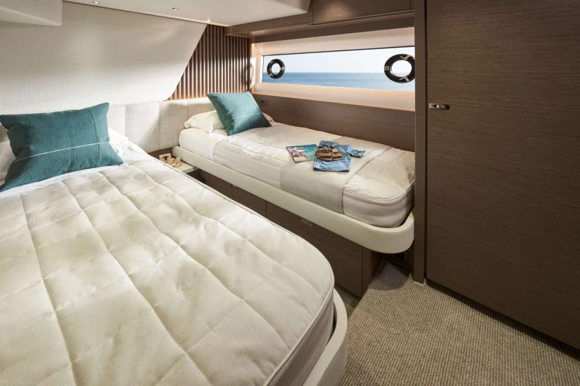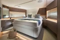 The full beam master stateroom takes pride of place, with its own private entrance via spiral staircase from the saloon providing ample storage space, a large ensuite bathroom plus an LED TV with Naim audio. Further aft there is an exclusive crew area (or an optional guest cabin) featuring two single berths and a private ensuite.