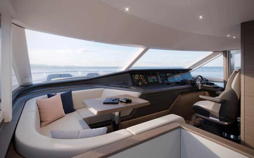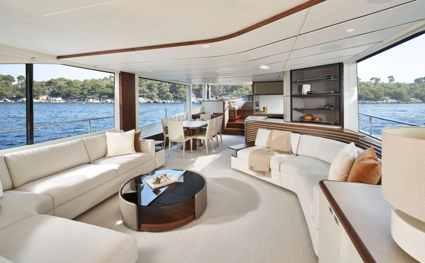 Offering a generous beam, the Y80 provides significant volume for an 80-foot motor yacht, whilst retaining elegant styling and design, both inside and out. The voluminous main deck offers an uninterrupted flow through from cockpit to the helm area, combined with panoramic views from the vast windows through-out the saloon. There is a seamless connection of each zone, from living area to dining arrangement, from well-equipped galley to day head, through to the wheelhouse with helm station and companion seating.