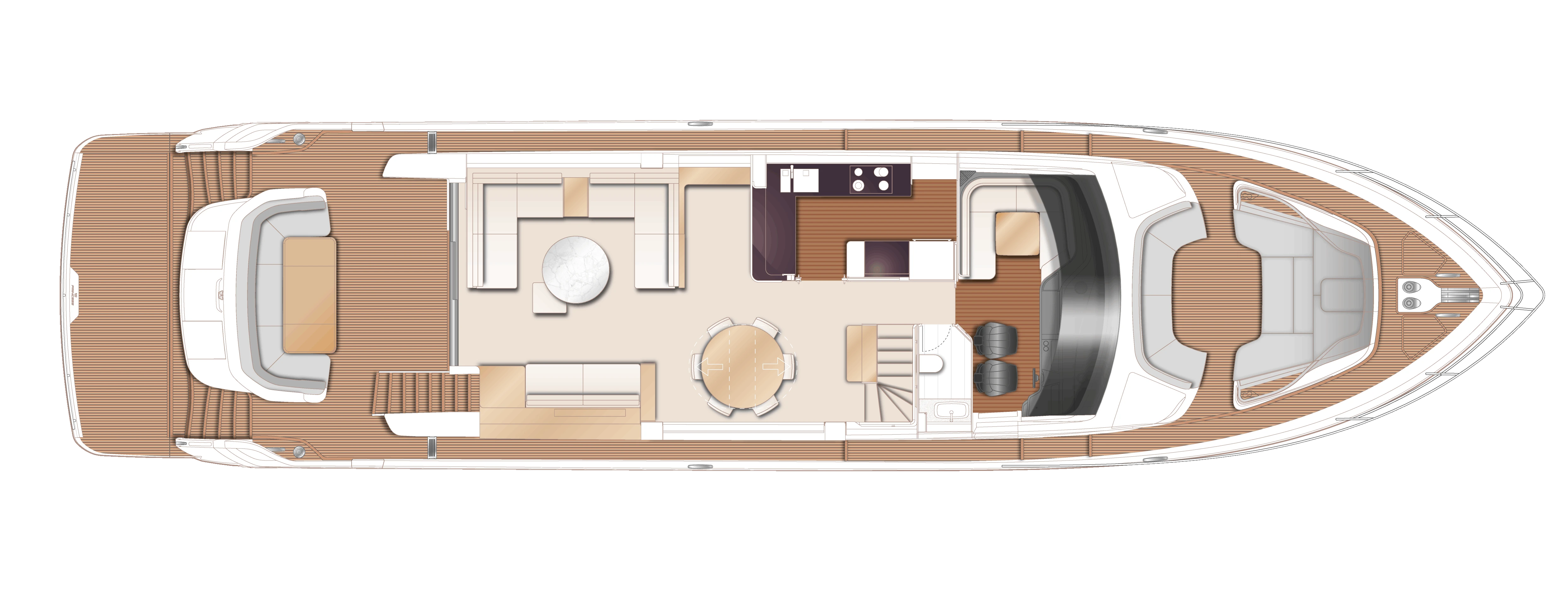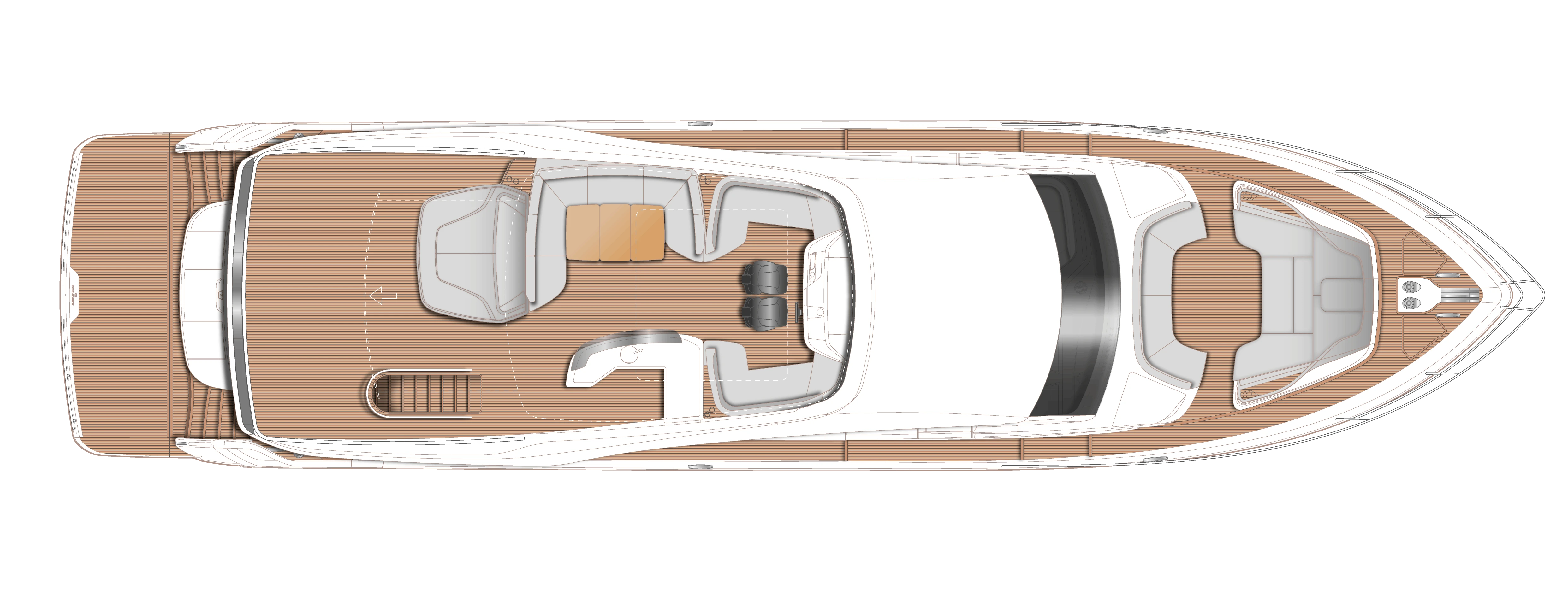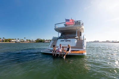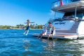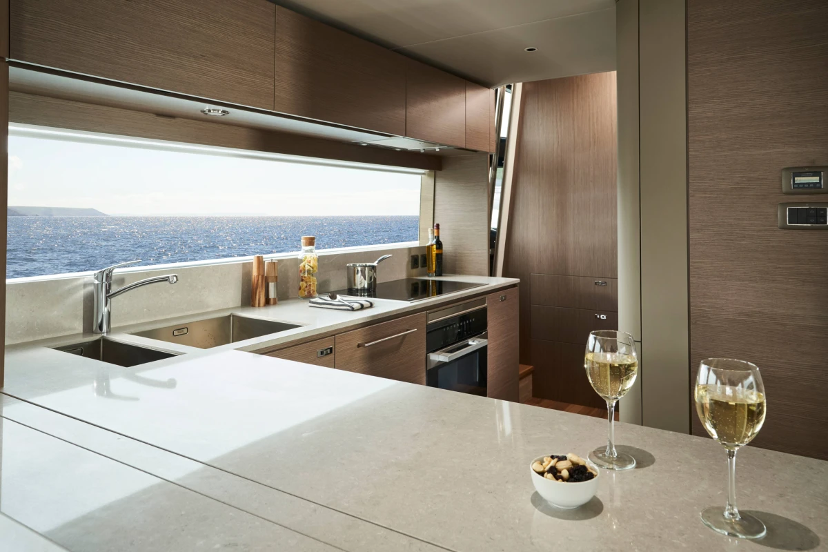 Her innovative flexible galley arrangement allows guests to choose between open plan and enclosed galley at the touch of a button, so you can open yourself up to the elements or close away for comfortable nights in seamlessly. Three key items have been defined in the design of this new addition to the Y Class range – light, space and guest comfort. This is increasingly apparent through her al-fresco living flybridge, to her large aft sunpad and forward-facing seating area, encompassing her spacious interior. An aft-mounted, hydraulic swim platform allows guests to cool off and enjoy water sports making this Y85 the perfect craft for entertaining on the water.