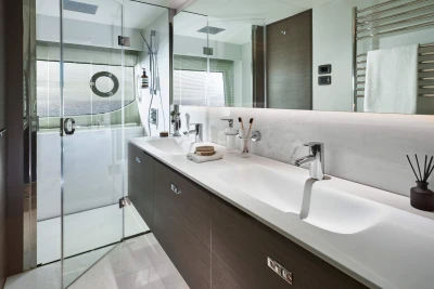 Her single-level main deck offers expansive undisturbed views, opening you and your guests to the world surrounding you. The journey through the main deck can be personalised to suit your needs, with a sliding door to the galley and an elegant electronic divider over the bar that transforms the space from open and sociable to intimate and closed. Below deck, four ensuite cabins can sleep up to 8 guests supported by class-leading separate crew quarters, with two crew cabins and a crew mess. The superior master cabin makes full use of the Princess Y85’s full width with natural light flooding the room and a large ensuite bathroom attached. Throughout the yacht, technology is state-of-the-art with Naim audio system featuring as standard throughout the cabin and main deck spaces.