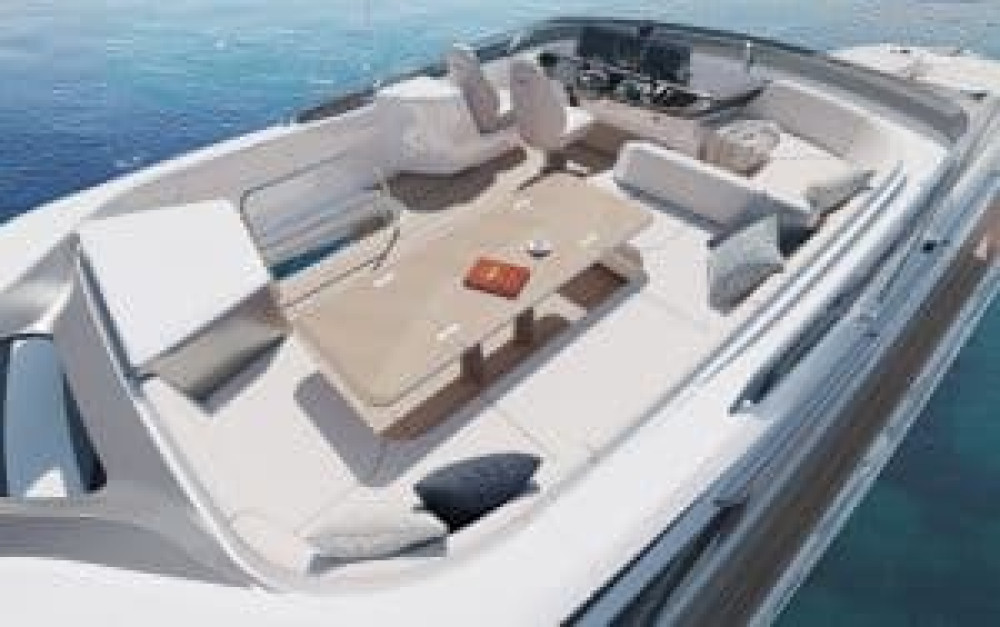 The 'life outdoors' theme continues into the generous and flexible cockpit which inspires relaxation with a large sunpad aft, stretching over the garage that is capable of housing a 3.3m tender. Forward of this is U-shaped seating and dining area with folding teak table. The cockpit countertop to port connects to the galley that is separated by an upswinging door which, when open, seamlessly connects the inside with the outside. There is an optional top-loading cool box, storage cupboard and to starboard there also is the option for an additional servery unit or an L-shaped aft facing seat. Explore this fantastic layout at the Cannes Yachting Festival 2024.
