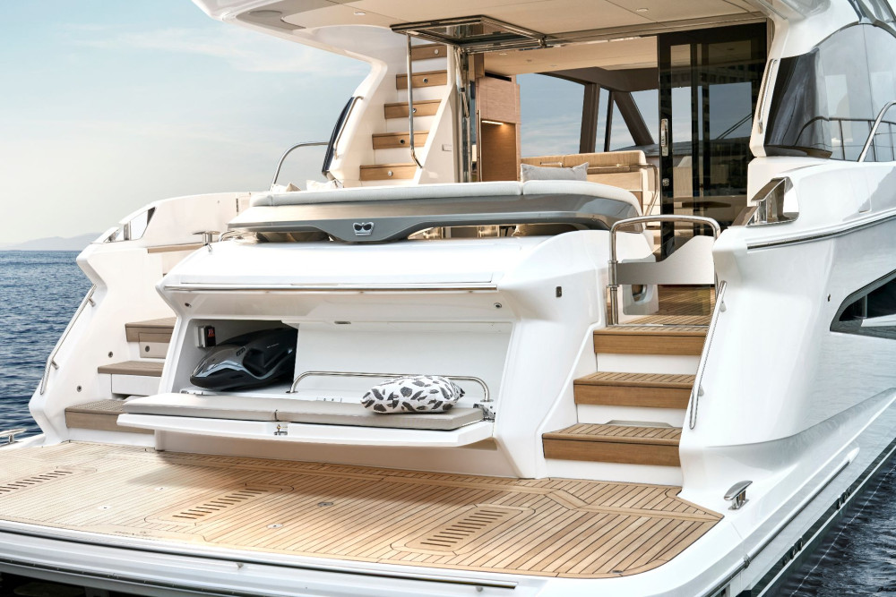 The cockpit continues the focus on maximising volume as this seamlessly connects to the saloon and galley to create an incredibly sociable space and also leads down to the bathing platform and mini 'beach club' transom area where owners have various options of storage for water toys or a waterside barbecue complete with sink and a fold down transom seat making this the perfect place to enjoy the water.