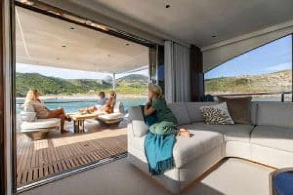 Based on the same hull and technical platform as the X80, the Princess Y80 sports a more traditional flybridge profile without an enclosed upper deck. Both models share the same lower deck layout, however. One of its defining options is an 'infinity' cockpit, featuring a rearranged layout with moving seats and a glass transom. The two sofas slide electrically in and out from the table to make the most of this new arrangement. A vast full-length flybridge and a versatile new foredeck terrace add yet more outdoor entertaining space.