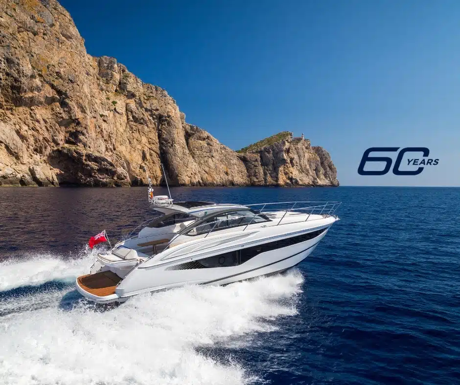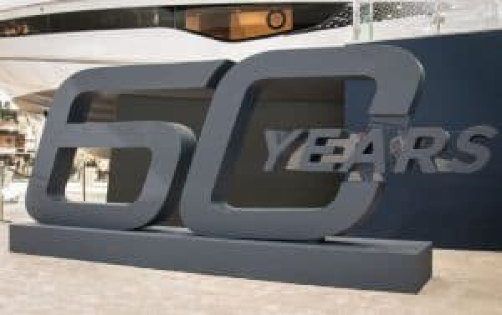 The updated model features a restyled profile including a vignetted hull graphic that extends the window line and incorporates a special '60 years' emblem denoting that this is a limited-edition yacht.