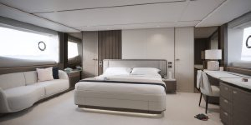 Offering a generous beam, the new Y80 provides significant volume and flexibility with owners able to specify innovative alternative layouts to suit their needs. A choice of three cockpit designs is available: a traditional U-shaped dining arrangement with additional storage solution for two SEABOBs; a central cockpit table with free standing furniture to seat eight guests; or Princess' new 'infinity cockpit' layout (first seen on the new Princess Y85) with electrically sliding seating and table mechanism to transform the area from a relaxed sofa arrangement to an informal dining area. The optional cockpit arrangements feature a large glass balustrade aft, offering uninterrupted views out to the submersible bathing platform and beyond.