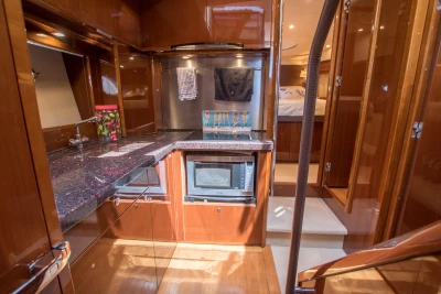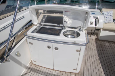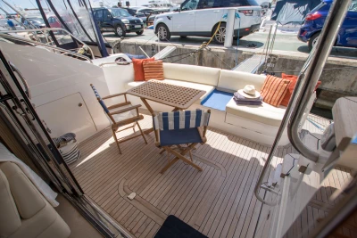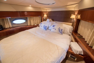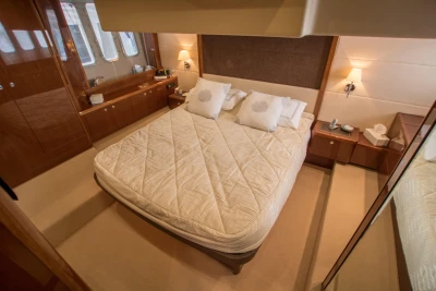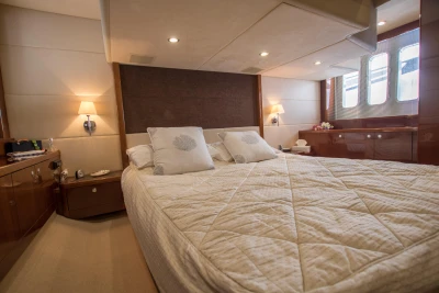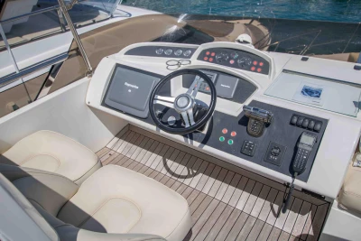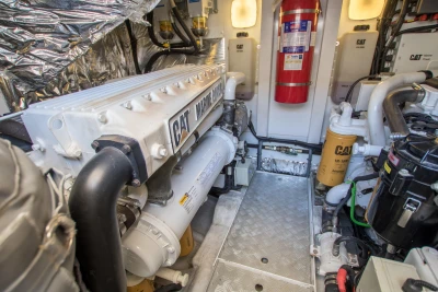 Twin 715hp Caterpillar C12 diesel engines • Raymarine E120 colour radar / chart plotter / GPS • Hydraulic passerelle with remote control • Full reverse cycle air conditioning • Serotina Cherry woodwork gloss finish • Chalk leather saloon upholstery • Washer / dryer in galley • Onan 11kW generator • Toilet holding tank • 19” LCD TV & DVD in Stateroom • Bimini • Electric windlass and anchor chain • Teak flybridge • Teak cockpit & bathing platform